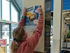 En frivillig i dyrevernorganisasjonen Anima som henger opp en plakat i en Coop butikk.