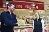 Landbruksminister Geir Pollestad (Sp) og kjøpmann Malin Pettersen fant tonen under statsrådens besøk på Eide Handel torsdag.