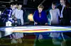 Skoleelevene Sebastian Lien og Ylva Sayuri Tinholt (begge 13 år) fra Bærum spiller kahoot med statsminister Erna Solberg under åpningen av restauranten og vitensenteret The Salmon på Tjuvholmen i Oslo onsdag. Initiativtaker Aino Olaisen og NMBU-rektor Mari Sundli Tveit er også til stede. Foto: Håkon Mosvold Larsen / NTB scanpix