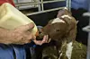 Her fores en ung kalv med råmelk, som ikke blir tillatt å selge til ordinært konsum. Foto: Terje Bendiksby, NTB