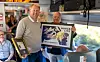 AVDUKET: Styreleder i Landslaget for lokalaviser (LLA), Øystein Øygarden og frimerkedirektør Roar Toresen i Posten Bring avduket det nye frimerket på Lokalavistoget torsdag. Foto: Posten Bring