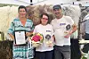 Ingrid Bakken Nilsen (midten) og Stig Roger Nilsen med to Spesialitet-merker som de har fått overrakt av Marit Strand (t.v.), fagsjef for Spesialitet i stiftelsen Matmerk.