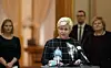 Partileder Siv Jensen (FrP) på pressekonferansen etter at de fire borgerlige partiene ble ferdig med budsjettforhandlingene. Bak står kunnskapsminister og partileder Guri Melby (V), barne- og familieminister og partileder Kjell Ingolf Ropstad (KrF) og statsminister og partileder Erna Solberg (H).