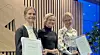 Helseminister Ingvild Kjerkol (midten) sammen med de to vinnerne av Intensjonsavtalens utmerkelser. Til venstre Maren Berg fra Opplysningskontoret for frukt og grønt og Hanne Guro Lund fra Fjordland AS. Foto: Elin Brunsdon