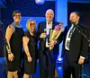 Laila Horgen, Marit Kvalvåg Pettersen og Thomas Eie delte ut Emballasjefagprisen til Morten Aas på Emballasjedagene i Sandefjord. Foto: Per Øyvind Nordberg