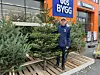 Butikkmedarbeider Thomas Holen ved Obs Bygg Haugenstua står klar med juletrær til kundene.