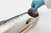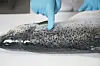 Han bruker laks som eksempel når han vurderer kvaliteten, men prinsippene ligner for andre fiskeslag. Først ser han på skinnet.