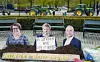 «Vi dyrker nye politikere» står det på en plakat av landbruksminister Olaug Bollestad (KrF), statsminister Erna Solberg (H) og finansminister Jan Tore Sanner (H).