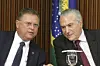 Brasils president Michel Temer (til høyre) og landets landbruksminister Blairo Maggi møtte søndag en rekke representanter for kjøttindustrien og innkalte ambassadører fra flere titalls land for å forsøke å legge lokk på kjøttskandalen. Foto: Eraldo Peres, AP/NTB scanpix