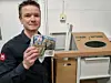 Butikksjef Christian Hagen hos Meny Ski Storsenter viser oss returpunktet på lageret. Før stasjonen ble flyttet, fjernet han en pakke med toner til en printer som var kastet i småelektrisk.